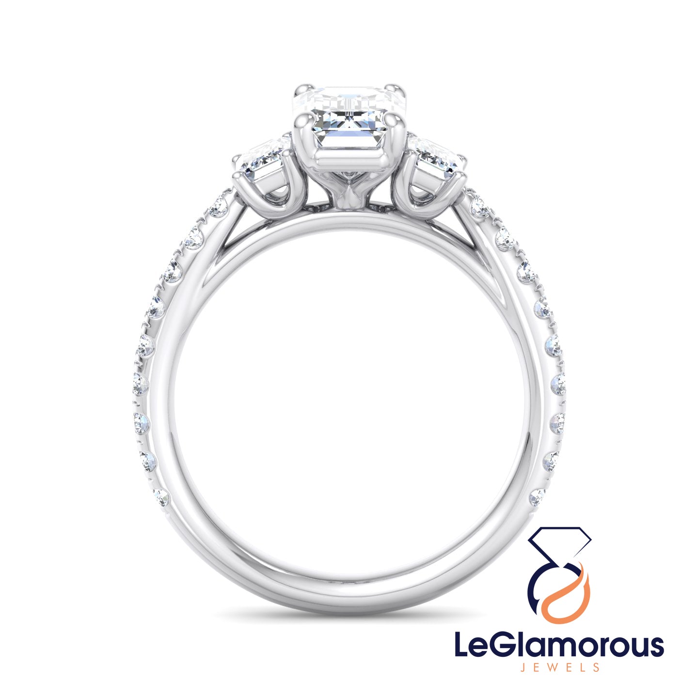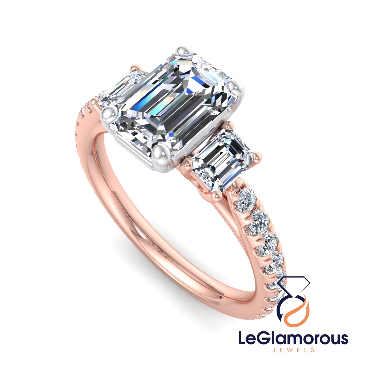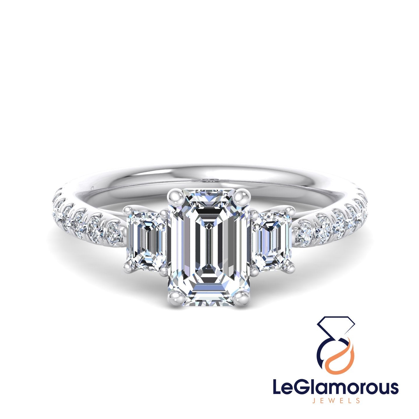 Moissanite Emerald Cut Three Stone Pave Setting Engagement Ring For Wedding
